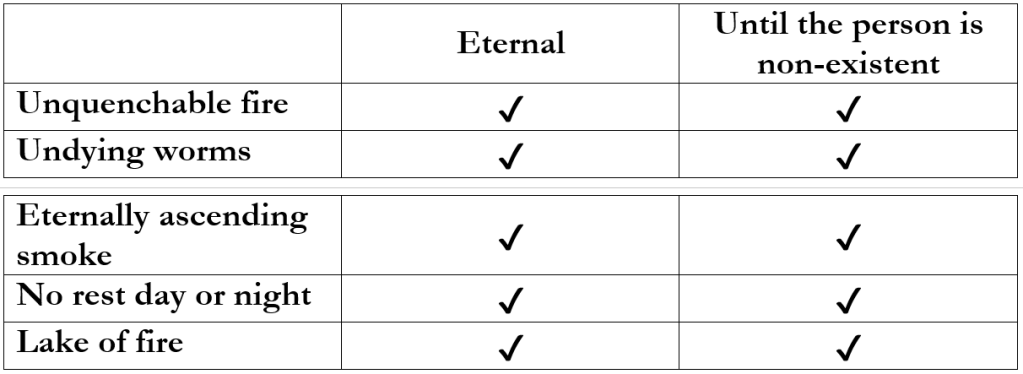 In the chart below we see that none of the verses that are commonly presented to prove eternal torment are decisive. Each one can be understood in either direction, sometimes depending upon whether the New Testament author is using a similar phrase with the exact same meaning that it had in its Old Testament context.