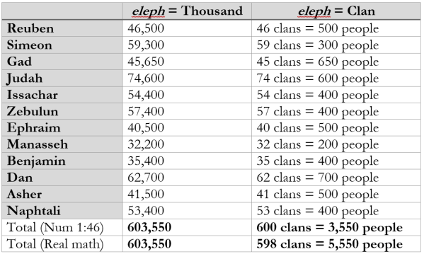 The end result of this approach produces a tiny population for the nation of Israel and also makes Moses incapable of doing basic math. The total number of clans is wrong! If we add the supposed clans together, we get 598 clans, but Moses apparently gets a total of 600. Furthermore, in Exod 38:25 half a shekel was given for each person in the census, which came to 301,775 shekels (half of 603,550). This math does not fit with the eleph = “clan” approach.