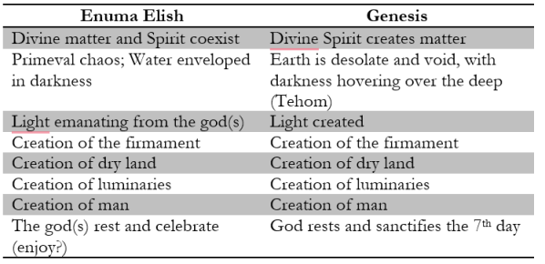 If we ignore the narrative elements of the story in Enuma Elish and merely abstract out the order of created things, we find the following parallels between Genesis and Enuma Elish: