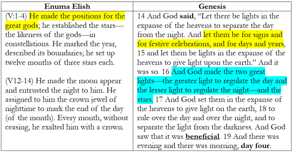 Moses carefully describes the sun and moon as the greater and lesser lights in order to make clear that neither are divine begins. In Enuma Elish, the heavenly bodies are the resting places of divine beings. In Genesis, the heavenly bodies are man’s calendar and light source. They don’t rule over man and command him to work, they exist to benefit mankind.