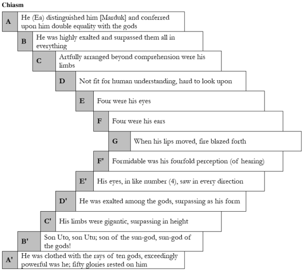 In the story Enuma Elish, the hero of the story who defeats the dragon and recreates the universe according to his desire is Marduk. Without question, he is the main focus of the entire story. Part of what signifies his importance early on in the story is the amount of space and literary detail that is put into the story of his creation. Below, you will see that an introductory section that describes Marduk’s birth and his attributes is followed by a chiasm that details his attributes.