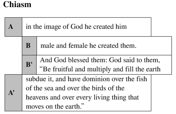 In each corresponding section, the author returns to the same topic. So, since section E talks about his four eyes, section E’ talks about his four eyes again. When we turn to Genesis, we see that a similar but shorter structure is found describing the creation of man: